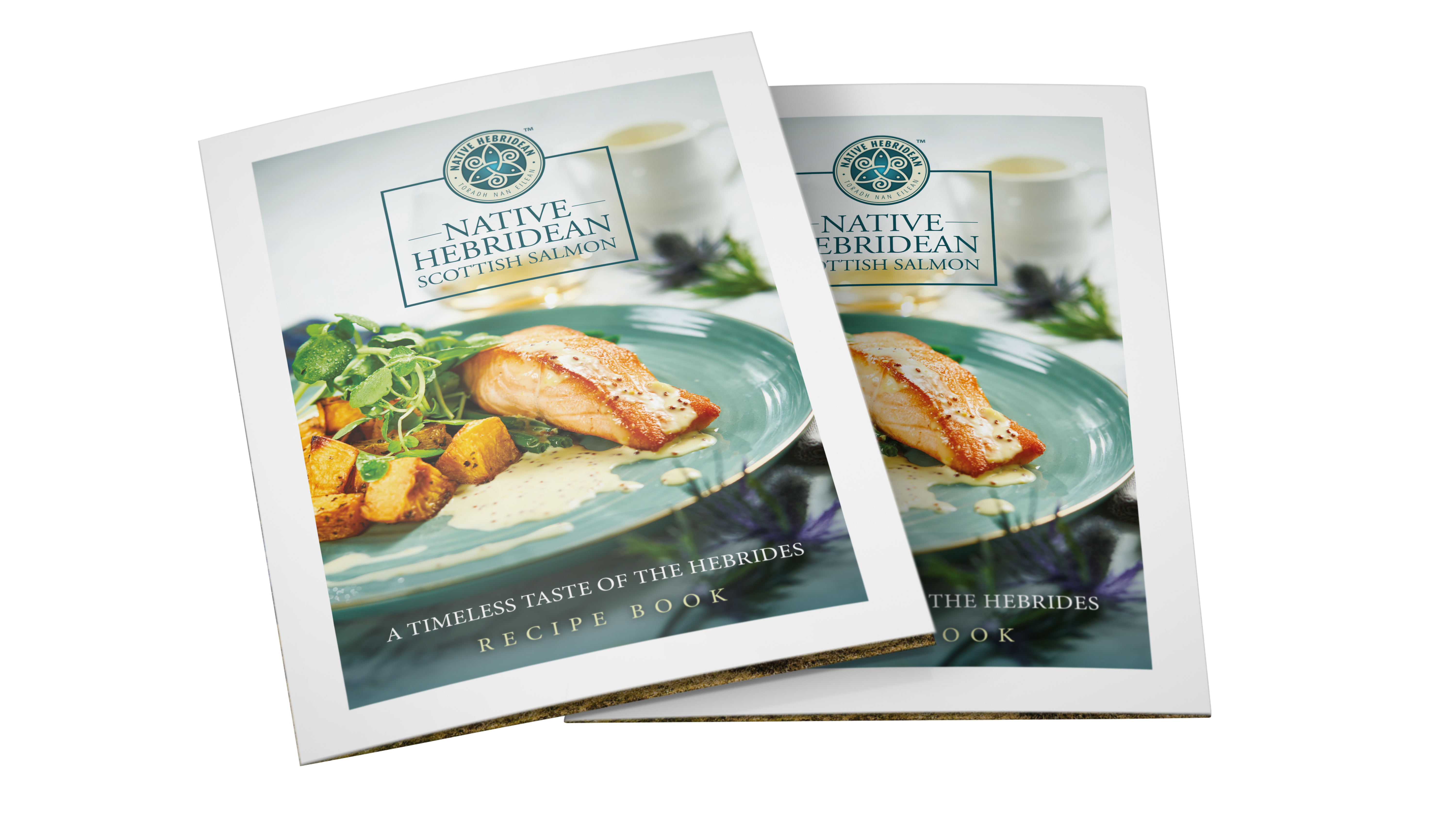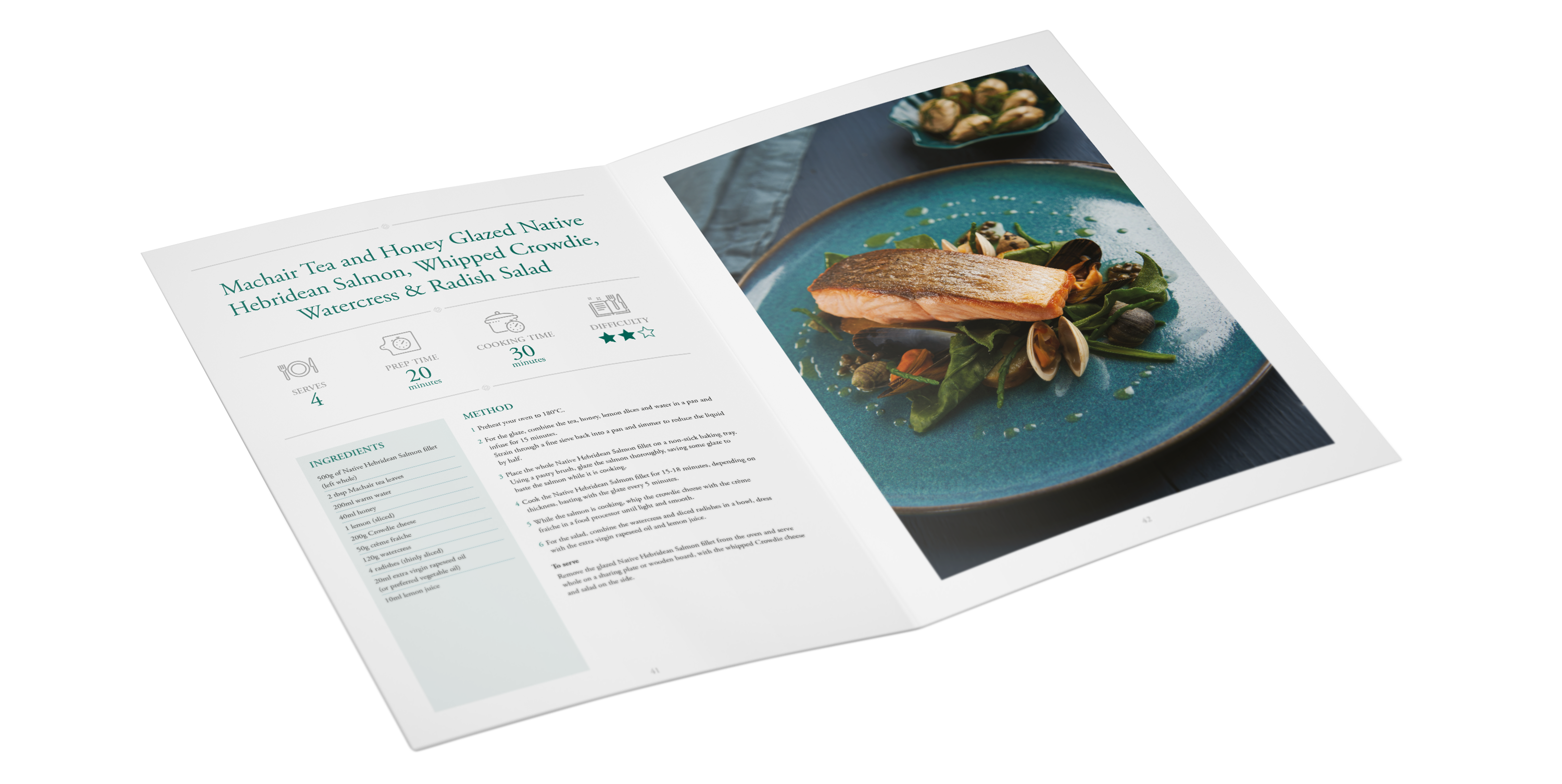 The design of a recipe book featuring recipes created by well-known chefs. Each recipe showcases the qualities of SSC’s Native Hebridean salmon.