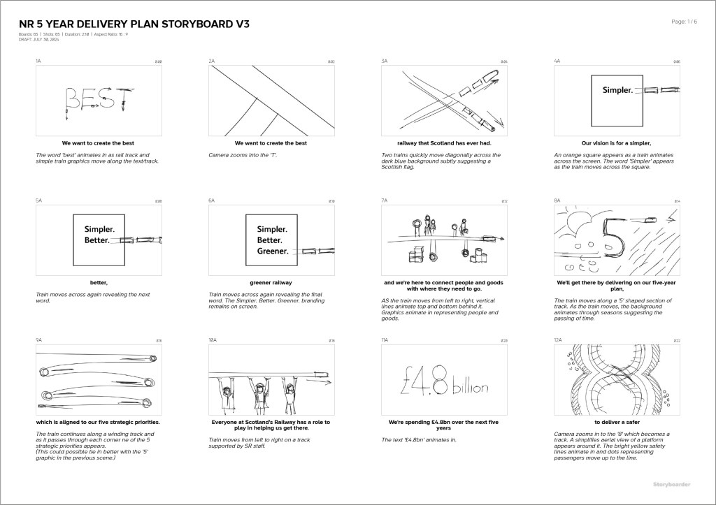 From a supplied script, a storyboard is produced, assets are created and an animation is built that details the delivery plan of Scotland’s Railway over the next five years.