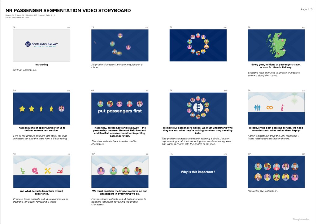 From a supplied script, a storyboard is produced, assets are created and an animation is built. It explains the development of individual passenger profiles that help Scotland’s Railway better identify the travel habits of Scottish rail passengers.